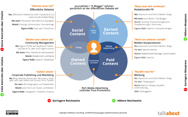 So können User via Twitter an öffentlichen Diskussionen teilnehmen (Social Content), in den offenen Dialog mit der Community treten, eigene Inhalte gezielt an die Stakeholder richten (Owned Content), als Kompetenzträger in Erscheinung treten (Earned Content) und auf Retweets anderer hoffen sowie per Promoted Tweets die Geschicke durch Mediabudget beeinflussen (Paid Content).