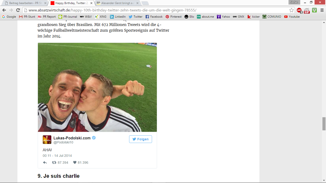 Noch auf dem Spielfeld twittert Lukas Podolski, nach der rauschende Ball-Nacht und dem grandiosen 7:1-Sieg über Brasilien, folgendes Foto. Twitter Germany nutzt dieses Bild jahrelang zur Promotion auf der Startseite. Insgesamt wird die Fußballweltmeisterschaft 2014 mit über 670 Millionen Tweets zu einem der größten Sportereignisse auf Twitter.