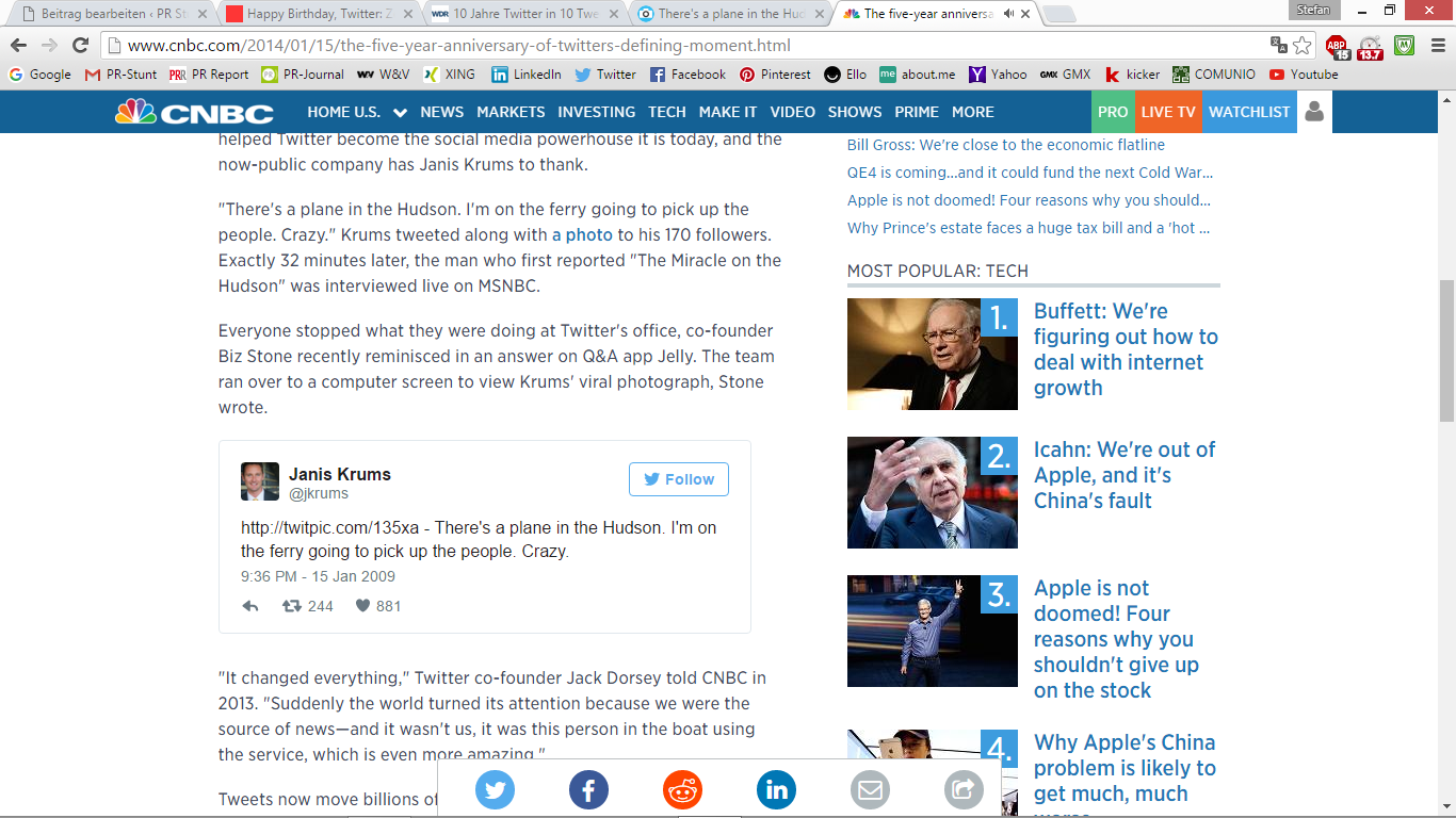 Janis Krums fotografierte im Januar 2009 die Notwasserung eines Flugzeugs im Hudson River. Dieser Tweet brachte für Twitter und den Journalismus den Durchbruch. Allzu deutlich wurde aufgezeigt, wie wichtig Twitter für die Echtzeit-Reportage bei bedeutenden Ereignissen ist. In Deutschland machte die BILD via Periscope die Live-Kommunikation während einer Bombendrohung zu Germanys next Topmodel gesellschaftsfähig.
