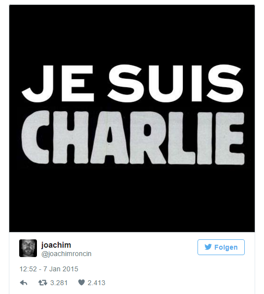 Nachdem im Januar 2015 vermummte Islamisten die Redaktionsräume des Satiremagazins Charlie Hebdo gestürmt und mehrere Mitarbeiter erschossen hatten, zeigten Menschen weltweit ihre Solidarität mit den Opfern und Angehörigen. Der Grafikdesigner Joachim Roncin entwarf innerhalb einer halben Stunde nach den Anschlägen, als Sinnbild der Anteilnahme, den Schriftzug „Je suis Charlie“. Leider wurde der Slogan von Merchandising-Herstellern kommerziell verwendet, da ein Antrag für eine urheberrechtlich geschützte Marke nicht rechtzeitig einging.