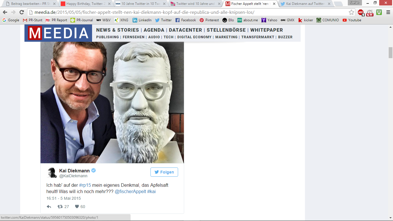 Ein ganz persönlicher Twitter-Meilenstein war die Inszenierung der Agentur fischerAppelt, für die ich als Teamleiter am Kölner Standort tätig bin. Als Zeichen gegen die Empörungskultur und Shitstorms im Netz, wurden auf der re:publica 2015 in Berlin drei Büsten-Statuen von Kai Diekmann, Alice Schwarzer und Sascha Lobo aufgestellt. Zum Clou wurde die Aktion, weil die Betrachter mit bestimmten Hashtags via Twitter die Skulpturen rege zum Weinen brachten. Der Gesamtherausgeber der Bild-Gruppe himself, sorgte zusätzlich für ein großes Medienecho – für mich abermals die Bestätigung, bei genau der richtigen Content Group gelandet zu sein.