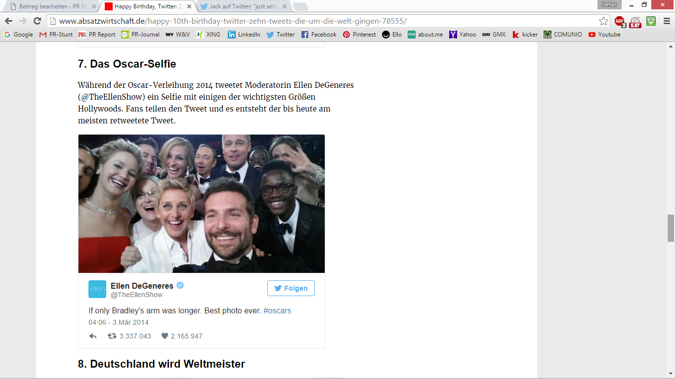 Während der Oscar-Verleihung im März 2014 tweetet Moderatorin Ellen DeGeneres ein Gruppen-Selfie mit einigen bekannten Hollywood-Größen. Das Foto wird zum meistverbreiteten Tweet aller Zeiten. Wie spontan das Oscar-Selfie wirklich war oder ob es sich um einen PR-Stunt von einem Smartphone-Hersteller handelte, wird wohl niemals final zu klären sein.