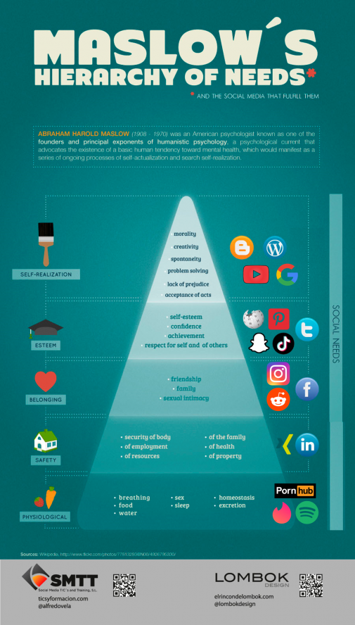 Den Anfang machen die physiologischen Bedürfnisse und aus meiner Sicht Spotify, Tinder und Pornhub. Pornhub habe ich oben begründet. Spotify und Tinder decken ebenfalls Grundbedürfnisse nach Malow ab. Mit Musik geht alles besser.