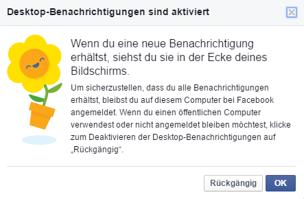 Ganz aktuell gehen mir insbesondere zwei Geschäftsgebaren von Facebook auf die Nerven, die eher technischen Naturen sind. Zum einen ist da das Pop-up-Fenster „Desktop-Benachrichtigungen sind aktiviert“. Eine automatische Voreinstellung, die seit der neuesten Nutzerbedingungen proaktiv installiert ist: