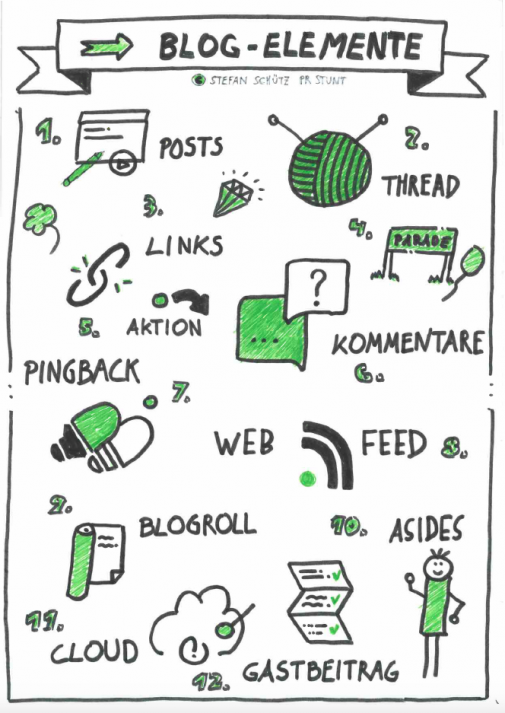 Es gibt viele verschiedene Elemente, die in persönlichen Blogs, Themen-Blogs oder Corporate Blogs zu finden sind. Hier eine Sketchnote dazu – meine erste übrigens. #MyFirstContent