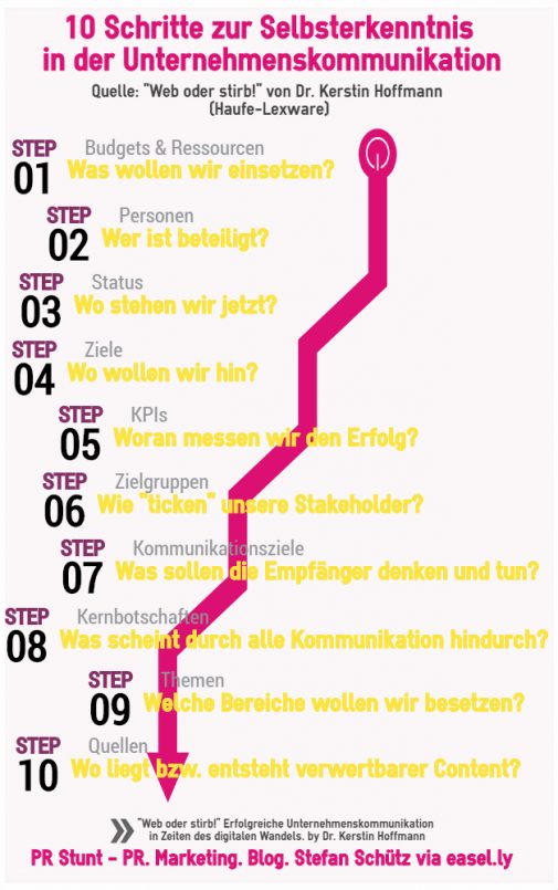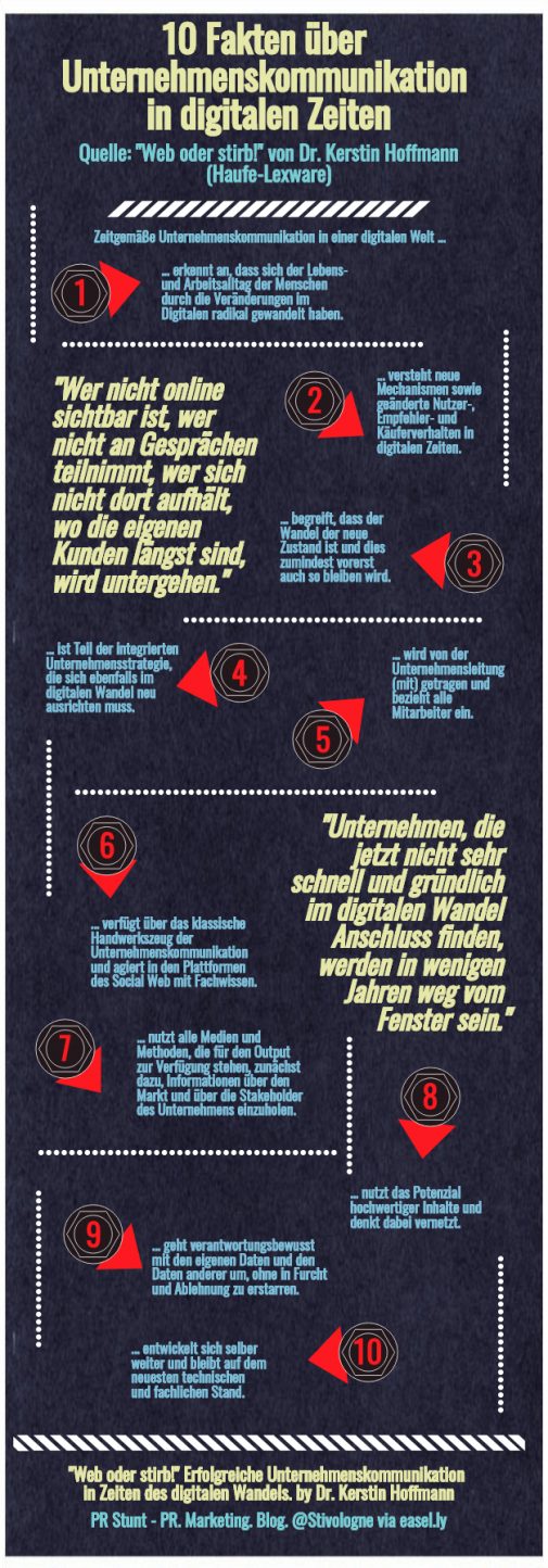 Jedoch können wir uns darauf vorbereiten. Kurzum: „Wer als Unternehmen online nicht sichtbar ist, wird gnadenlos untergehen. Also aus der Wahrnehmung derjenigen verschwinden, die bisher zu den Interessenten, Multiplikatoren und Kunden des eigenen Angebots zählten.“ Es geht hierbei um passgenaue Zielgruppen, relevante Inhalte, zeitgemäße Strukturen, angesagte Plattformen und den transparenten Umgang damit. Um nicht weniger als einen Paradigmenwechsel innerhalb der Unternehmenskommunikation.