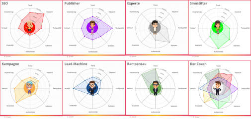 Wie der vorherigen Tabelle und den dazugehörigen Ausführungen zu entnehmen ist. Können die Größe des Vorhabens sowie die vorhandenen Ressourcen stark variieren. Und entsprechend Einfluss auf die Content-Planung nehmen. Unabhängig davon sind in der Praxis unterschiedliche Persönlichkeiten anzutreffen. Die letzte Abbildung zeigt exemplarisch einige davon.