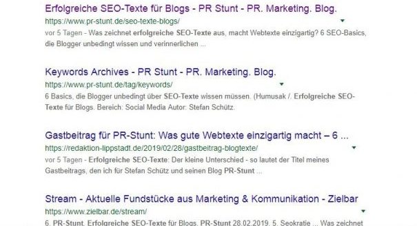 Diese Links, die auf die eigene Website weisen, sind von den Suchmaschinen als wertvoller erachtet – fallen somit kräftig ins Gewicht. Zumal unter anderem hierdurch die Anzahl der Visitors und hoffentlich auch die Besuchsdauer steigt. Darauf habe ich andererseits wenig Einfluss. Als Formel gilt: Finden die Blogpost Anklang, steigt die Wahrscheinlichkeit, dass Dritte sie zitieren und darauf verlinken.