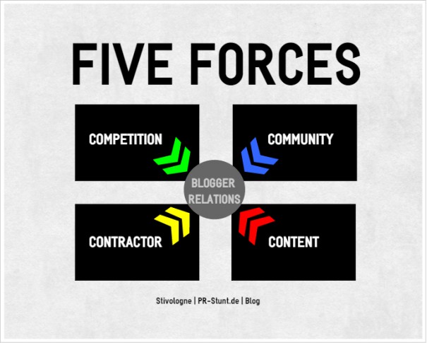 Das Five-Forces-Modell ist ein weiteres Hilfsmittel zur Strategie-Analyse im Rahmen der unternehmerischen und privaten Blog-Planung. Die Attraktivität einer Branche (hier: Thema des Blogs oder die Blogger Relations als solche) basiert demzufolge auf fünf „Wettbewerbsaspekten“. Letztgenannter Begriff passt im Grunde genommen nicht so ganz zur Blogosphäre, da unter den BloggerInnen ein toller Zusammenhalt vorherrscht und Neid und Missgunst kaum eine Rolle spielt: