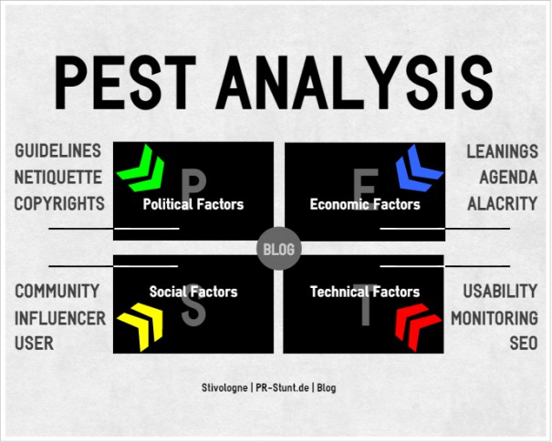 Die sogenannte PEST-Analyse hat sich innerhalb der strategischen Planung als verständliches und flexibles Tool bewährt. „PEST“ steht für politische (political), wirtschaftliche (economic), sozio-kulturelle (socio-cultural) und technologische (technical) Einflussfaktoren. Mittlerweile finden rechtliche (legal) und ökologische (ecological) Aspekte ergänzend Eingang. Hinsichtlich der Blog-Strategie sind insbesondere die rechtlichen Gesichtspunkte zunehmend von Bedeutung. Im übertragenden Sinne könnte eine entsprechende Grafik so aussehen: