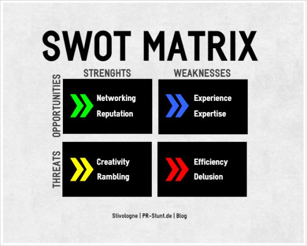 Bei der SWOT-Analyse helfen die englischen Bezeichnungen Strenghts (Stärken), Weaknesses (Schwächen), Opportunities (Chancen) und Threaths (Risiken) für ein erstes Verständnis. Hierbei geht es demnach um eine objektive Betrachtungsweise der eigenen Stärken und Schwächen sowie Abwägung der Chancen und Risiken. Auf das hiesige Blog bezogen heißt das exemplarisch: