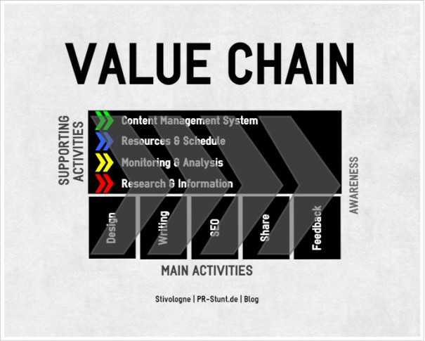 Die Wertkette (Value Chain) stellt bei mir die Stufen der Blogpost-Erstellung als eine geordnete Reihung von Aktionen dar. Durch strategisch relevante Tätigkeiten können zielgerichtete Erfolge hervorgerufen oder umgekehrt Ziele erfolgreich realisiert werden. Grundsätzlich lassen sich neun solche Anstrengungen unterscheiden. Fünf Primäraktivitäten, die den eigentlichen Wertschöpfungsprozess beschreiben, und vier Unterstützungsaktivitäten, die den Wertschöpfungsprozess sinnvoll ergänzen: