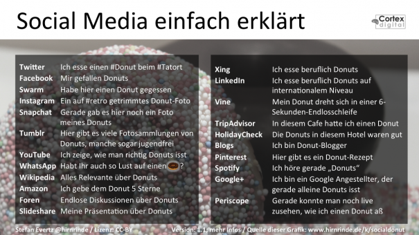 Geduld und Verständnis für die Materie aufzubringen ist das Eine. Die richtige Plattform, das geeignete Instrument zu wählen das Andere. Zeit haben wir keine oder nur gering. Spannen wir deshalb den Bogen zu Snackable Content und berufen wir uns bei der entsprechenden Auswahl auf das bekannte Bild des „Social-Media-Donuts“, welches Stefan Evertz vortrefflich oder exquisit erstmals auf Deutsch in neuester Version gebacken hat: