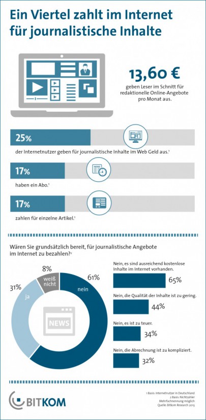 Ein Viertel aller Internetnutzer in Deutschland geben laut BITKOM bereits Geld für journalistische Inhalte aus. Mit einem Anteil von 31 Prozent werden kostenpflichtige redaktionelle Angebote am stärksten von den 30- bis 49-Jährigen genutzt. Insgesamt 17 Prozent zahlen eine monatliche Pauschale in Form eines Abos. Die Nutzer lassen sich das nach eigenen Angaben im Schnitt 13,60 Euro pro Monat kosten.